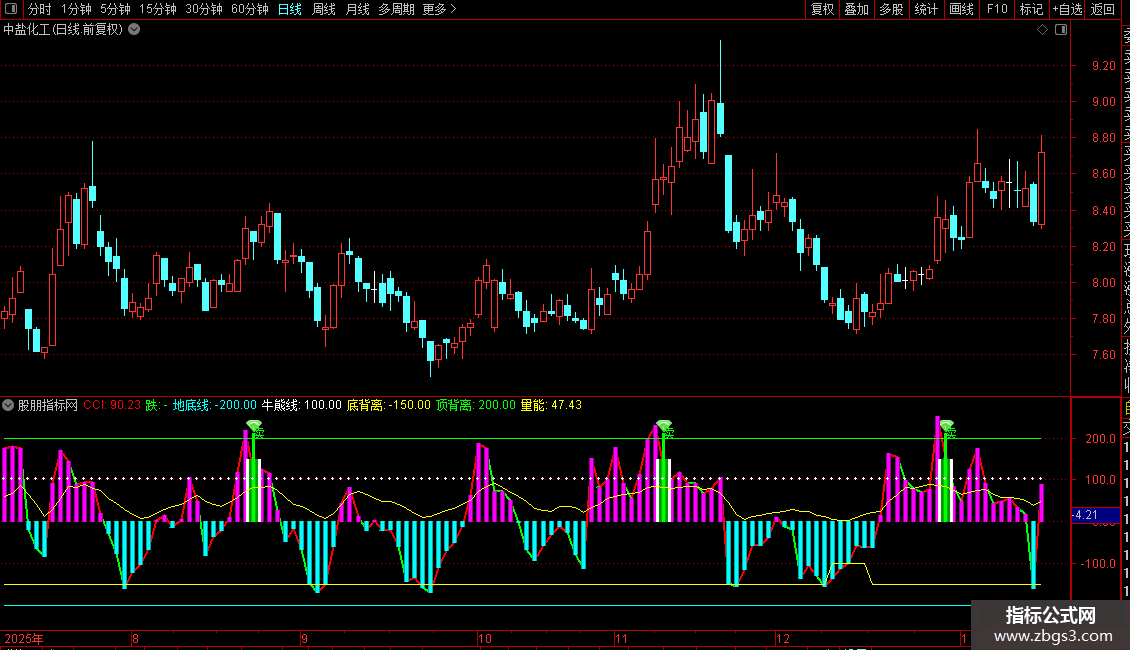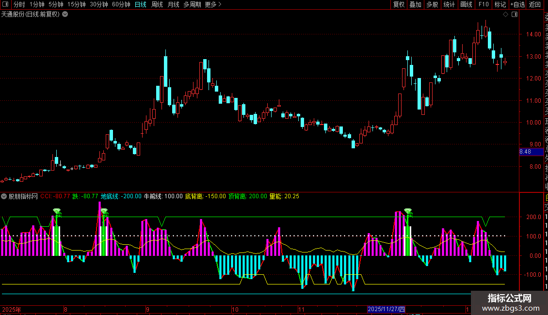 一.cci(优化版)指标 优化了底背离, 顶背离, 量能线, 转强, 转弱提示 当CCI中的CCI线下穿到 -100 线下,越低越好成功率更高。
