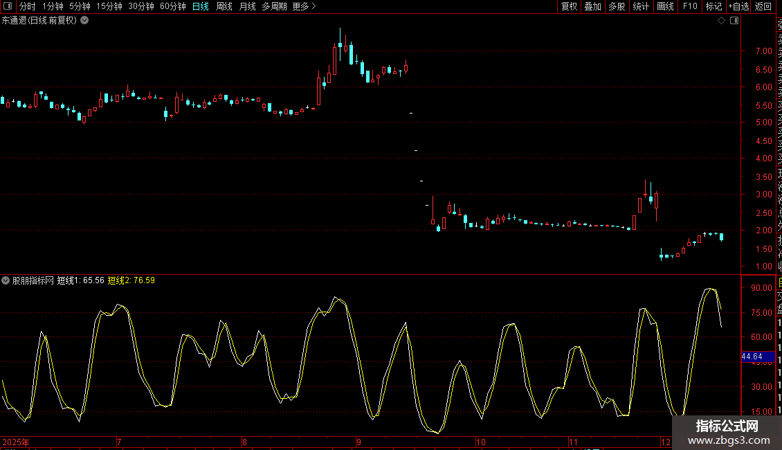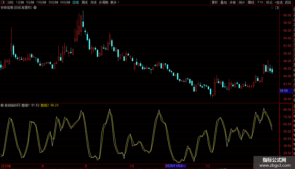 当白线从下向上穿过黄线,且两者的交叉点小于35的时候,尾盘跟进。
