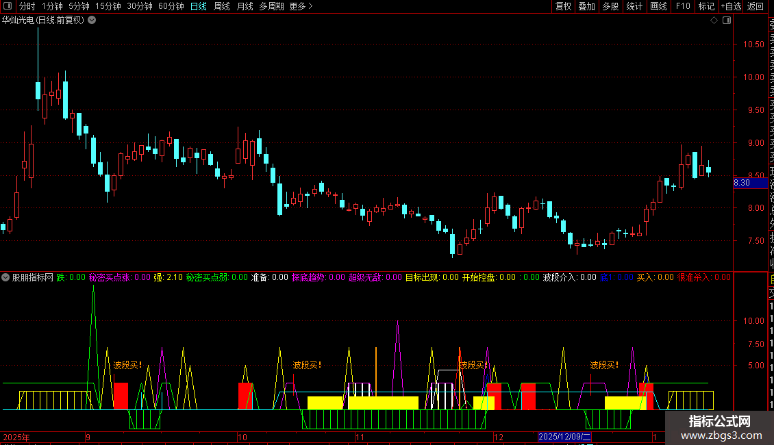 波段买入:IF(CROSS(D1,K1),5,0),COLOR0099FF,POINTDOT;