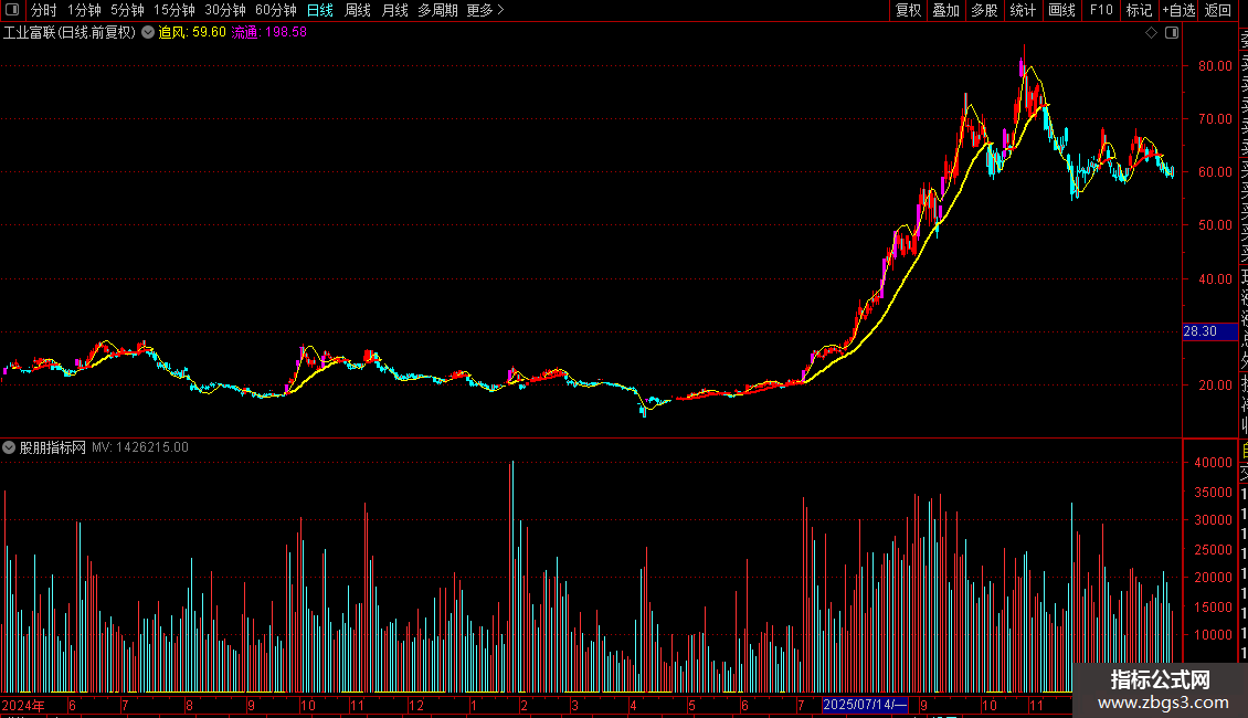 输出MV60:MV的60日简单移动平均,COLORFF9900