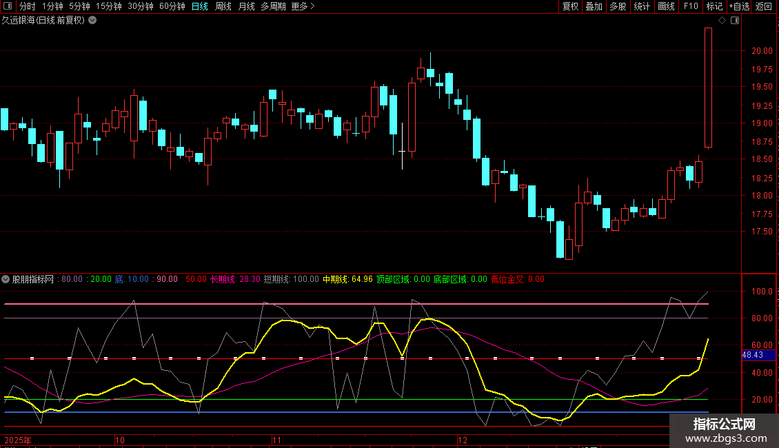 低位金叉:50*(长期线<15 AND REF(长期线,1)<15 AND 中期线<18 AND 短期线>REF(短期线,1) AND CROSS(短期线,长期线) AND 短期线>中期线