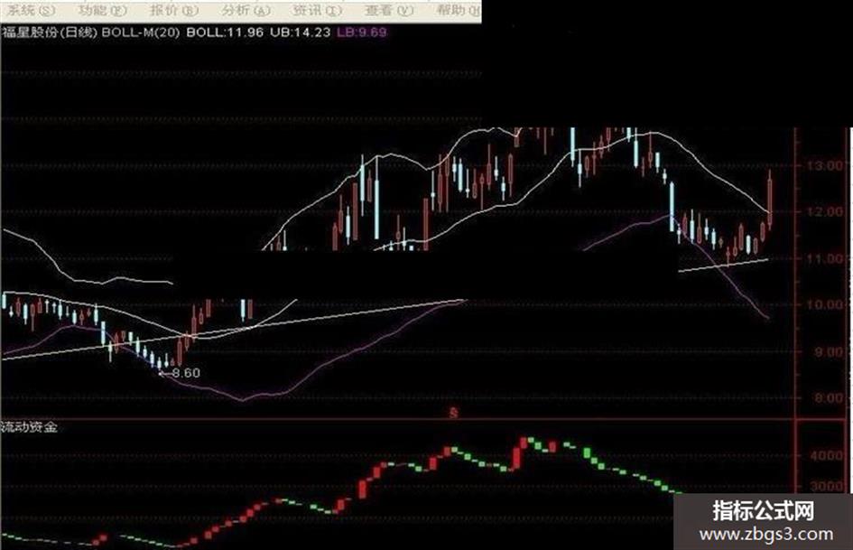 VAR1:=SMA(AMOUNT,10,1)/10000; VAR2:=REF(VAR1,1); VAR3:=SMA(AMOUNT,10,1)/10000; 资金运转: STICKLINE(VAR1>VAR2,VAR1,VAR2,3,0),COLORRED; 资金流失: STICKLINE(VAR1< VAR2,VAR1,VAR2,3,0),COLORGREEN;