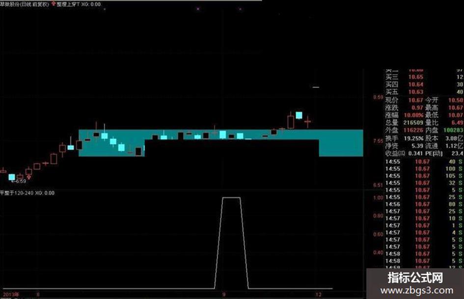 说明:股价在120日线和240日线之间横盘整理3周以上,突然突破前高线,将有20%以上的收益;