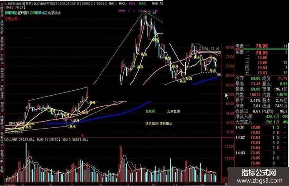 ZT:=REF(C,1)*1.1-C<0.01 AND H=C;{涨停}