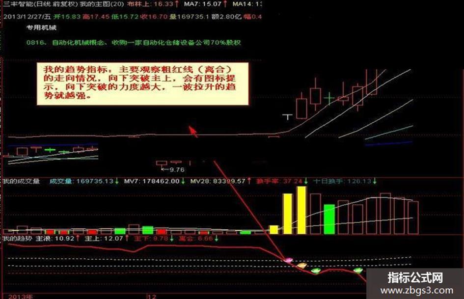 我的趋势指标:主要观察粗红线(离合)的走向情况,向下突破主上,会有图标提示,向下突破的力度越大,一波拉升的趋势就越强。