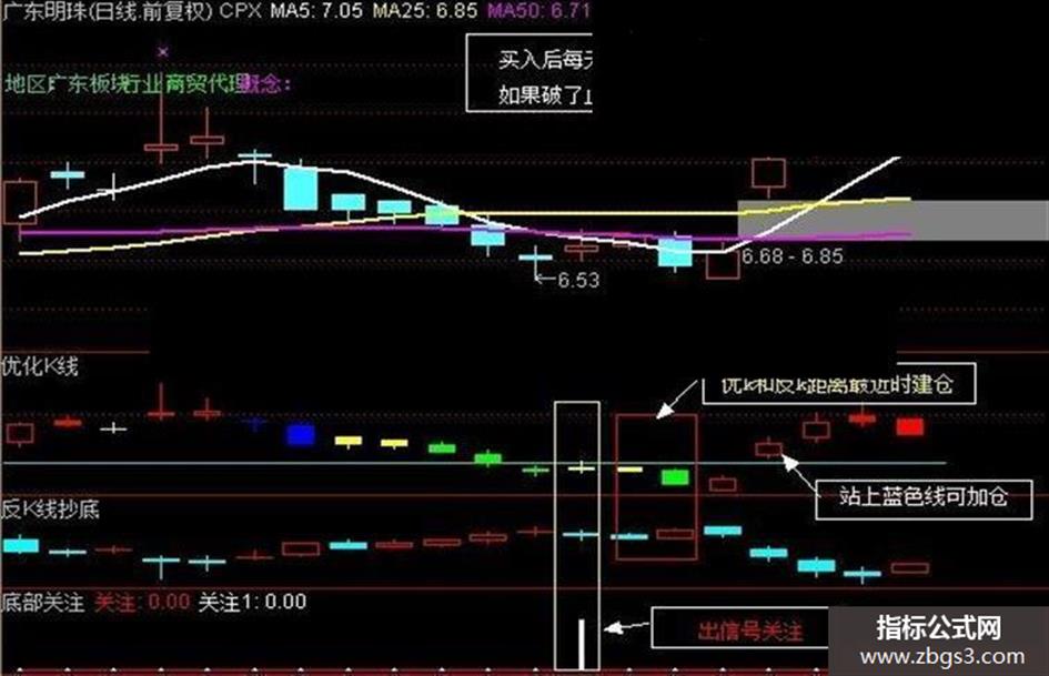 2.底部关注出现白柱信号后,不要急着买,等优化k线的低点和反k线的高点靠近的时候在介入;