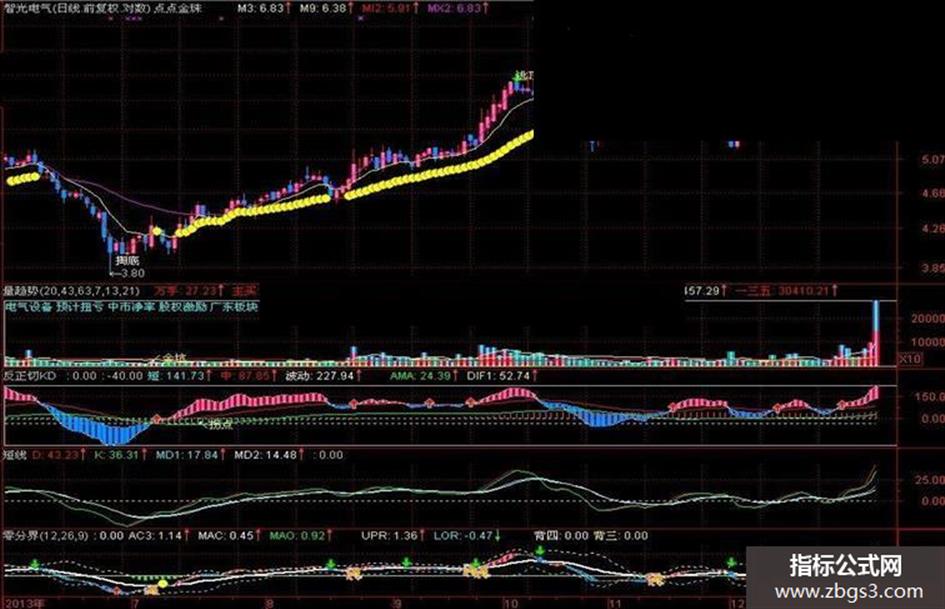 买点比较好。卖点稍有滞后。但我叠加了短线逃顶小指标,估计短线顶部卖出不是太大的问题。指标就是均线系统,利用均线粘合的原理寻找买入切点,图中金色圆点为上升波段。如同金珠点点。望大家能赚得盆满钵满!!!