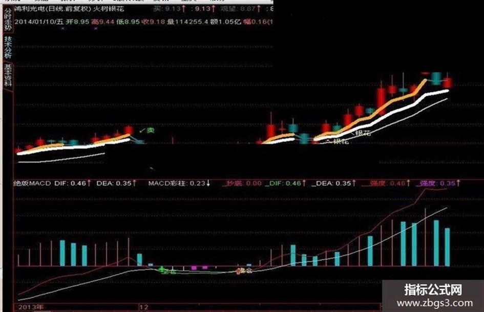和大家分享一个本人一直在用,而且用的很好的通达信主图公式---火树银花!只要银花信号出现,结合绝版MACD附图和热点,杀黑码,牵大牛十拿九稳!副图是本人2013年12月13日建仓的股票300219鸿利光电,2014年1月8日放量涨停时出货获利32%!不敢独吞,和大家分享,希望大家才参考!见图:
