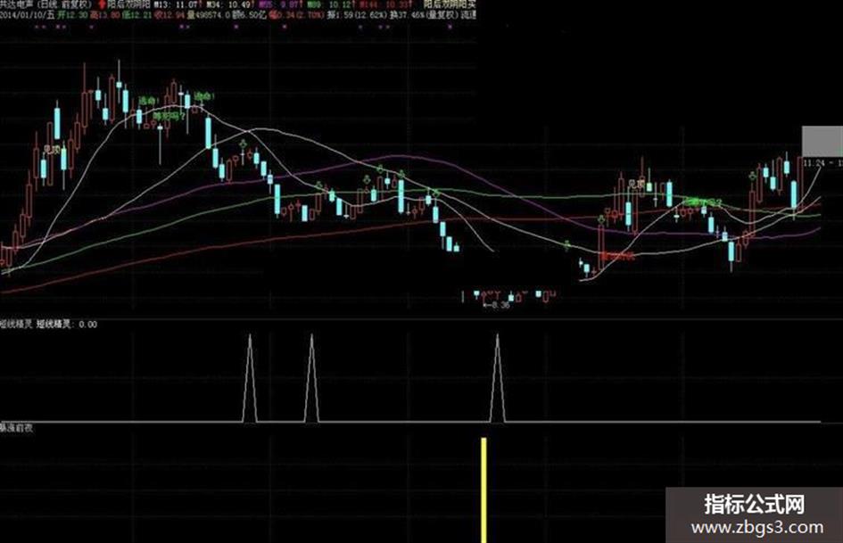 顺便说一下,有人说暴涨前夜信号多,且不准,那是个没优化的指标,今天一起把优化后的爆涨前夜图一起发上,指标还在优化,暂发个短线精灵 L1:=(EMA(CLOSE,3) - EMA(CLOSE,13)); L2:=EMA(L1,9); L3:=BARSLAST(CROSS(L1,L2)); L4:=REF(L3,L3+1); L5:=L2<REF(L2,L4); 短线精灵:CROSS(L1,L2) AND L5;
