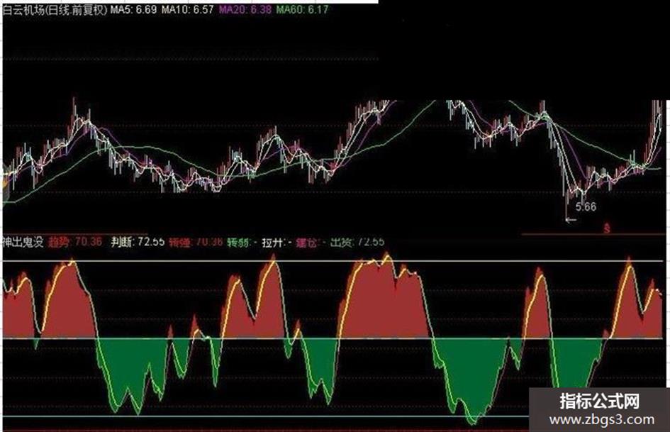 出货:IF(判断>50 AND 趋势<判断,判断,DRAWNULL),COLORLIGREEN,LINETHICK2;