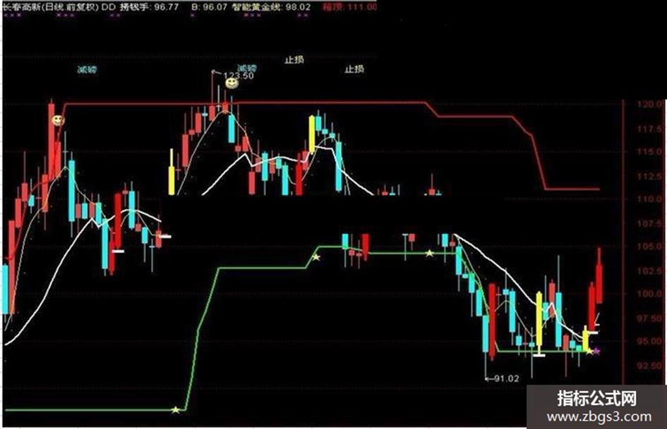 STICKLINE(买进条件 AND 捞钱手>智能黄金线 AND 智能黄金线>REF(智能黄金线,1),L,L*0.998,7,0),COLORWHITE;