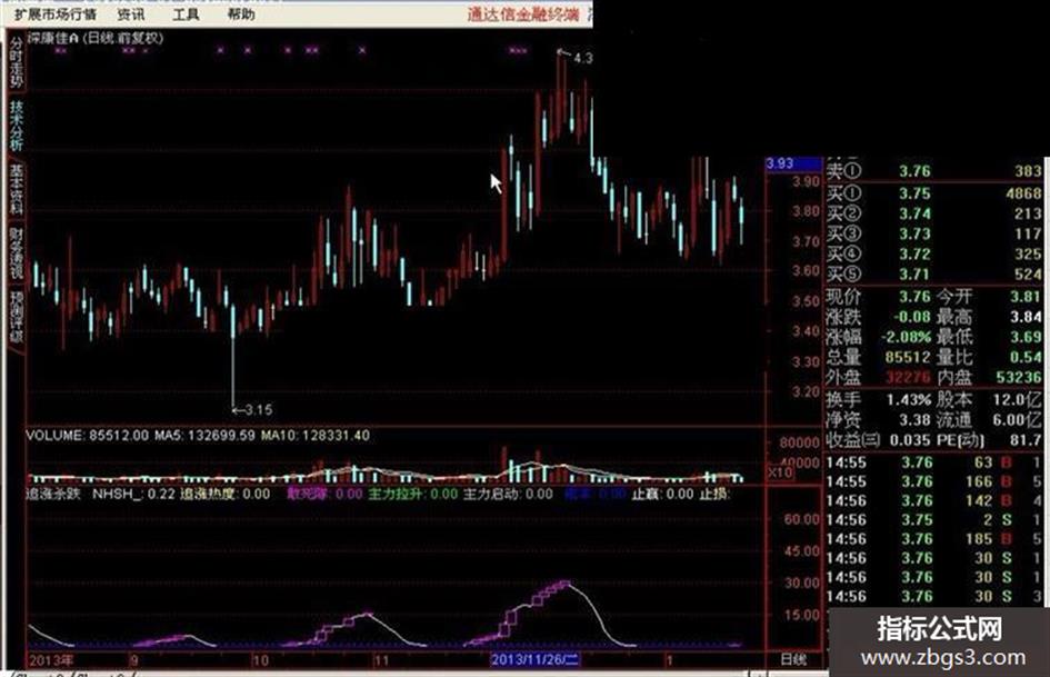 止赢:IF((((VAR29 > 0) AND (VAR29 > REF(VAR29,1)))),(HHHD * 1.06),0),LINETHICK0,COLOR0000FF;