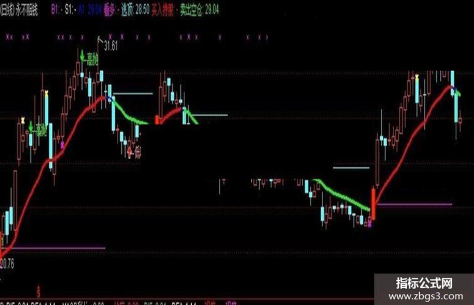 看多:IF(A1X>=0 AND BARSLAST(CROSS(A1X,0))>0,REF((C+O)/2,BARSLAST(CROSS(A1X,0))),DRAWNULL),COLORMAGENTA{,LINETHICK2};