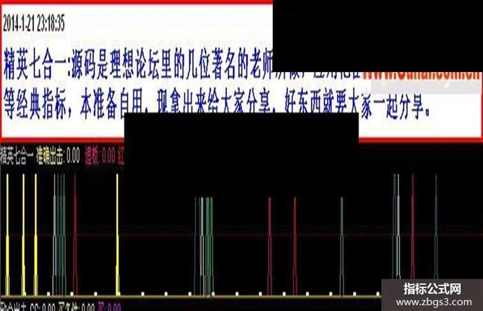 精英七合一:源码是论坛里的几位著名的老师所做,应用范围包括抄大底,抓涨停等经典应用实战指标。本来是为节省电脑的空间所做,准备自用,现拿出来给大家分享,好东西就要大家一起分享
