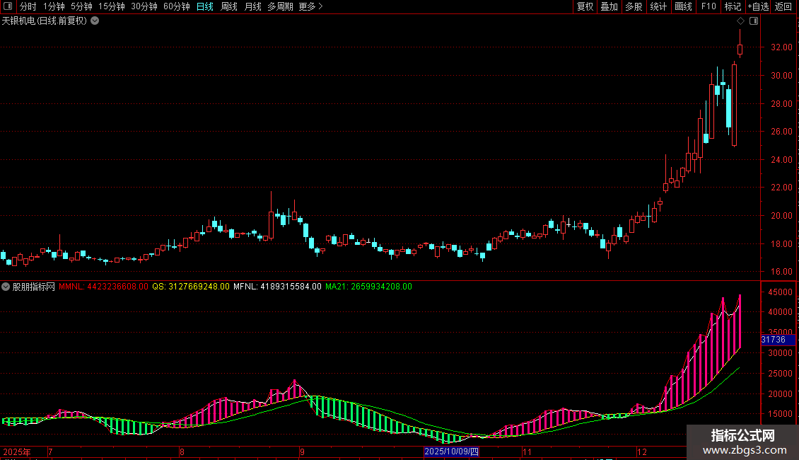 - MFNL(白线):快速能量线,对动量变化反应灵敏,用于捕捉短期波动。