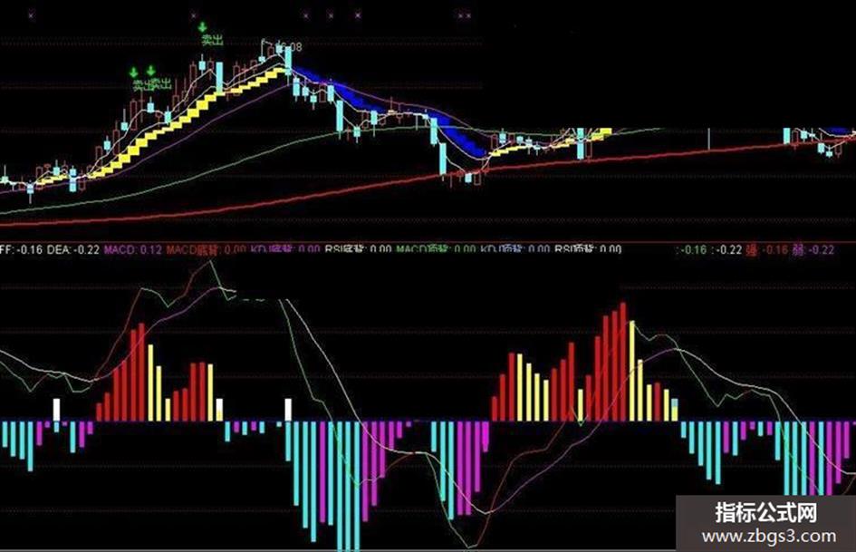 STICKLINE(MACD<=REF(MACD,1) AND MACD>0,0,MACD,1,0),COLORYELLOW;