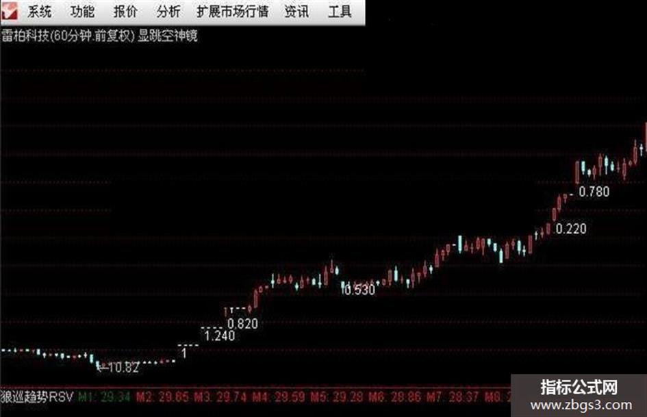 快过节了,拿出一个在主图上--->显示跳空缺口和-->跳空价格的实用公式给推荐的好友用,请放在副图夹内,在主图上右键点第3行 主图指标 ->选叠加其它指标 找到它即可 QK:=IF(L>REF(H,1),L-REF(H,1),IF(H<REF(L,1),REF(L,1)-H,DRAWNULL)); DRAWNUMBER(L>REF(H,1),L,QK); DRAWNUMBER(H<REF(L,1),H,QK);